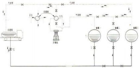 Initially, the liquid phase pipe between the tank truck and the storage tank is opened. If the liquid level in the tank truck is higher than that in the storage tank, it will automatically flow into the storage tank and stop flowing when equilibrium is reached. If the liquid level in the tank truck is lower than that in the storage tank, the compressor is started directly, with the four-way valve in the positive position. Gas is drawn from the storage tank, pressurized, and then discharged into the tank truck through the compressor. At this time, the pressure in the tank truck increases, and the pressure in the storage tank decreases, causing the liquid in the tank truck to flow into the storage tank under the action of the pressure difference. (See diagram below)